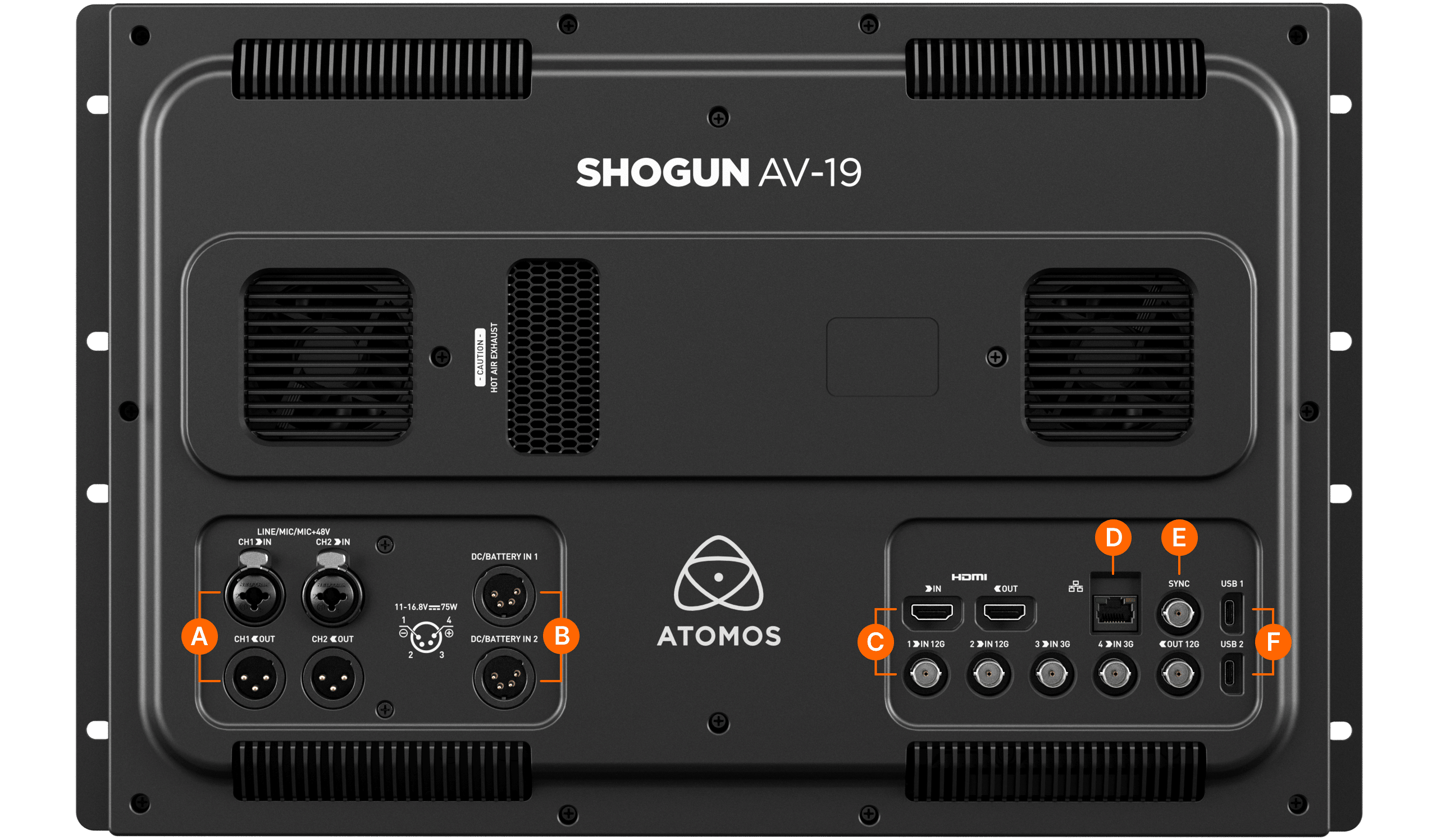 Shogun AV-19 supports demanding production workflows with comprehensive SDI and HDMI I/O, audio connectivity, timecode, and power options.